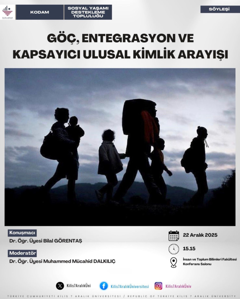 Söyleşi 22 Aralık Pazartesi günü saat 15.15'te İTBF Konferans Salonunda yapılacaktır. Bu söyleşi kapsamında Dr. Öğr. Üyesi Bilal GÖRENTAŞ "Göç, Entegrasyon ve Kapsayıcı Ulusal Kimlik Arayışı" başlıklı bir sunum gerçekleştirecektir.